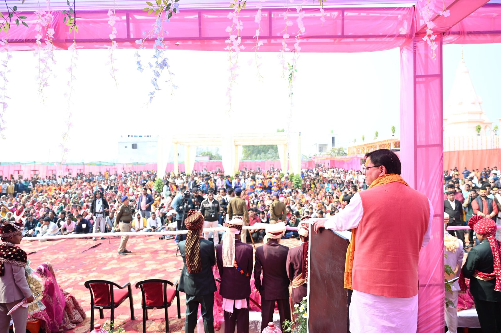 खटीमा, 15 फरवरी,2026 मुख्यमंत्री पुष्कर सिंह धामी ने नौगवां ठग्गू में श्री गौरी शंकर महादेव मन्दिर प्रांगण में सामूहिक विवाह समारोह में प्रतिभाग कर नव दम्पतियों को अपना आशीर्वाद, बधाई व शुभकामनायें दीं।